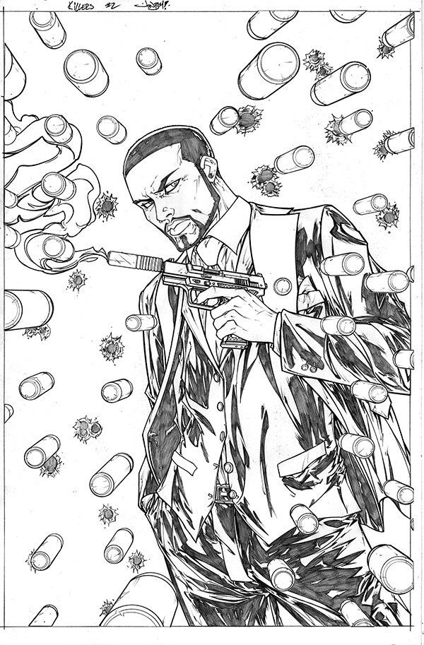We are auctioning off Jonboy Meyers' INCREDIBLE Original Art for the cover to Valiant Entertainment's Killers #2 (as shown on the right, with the colored and published version on the far right).